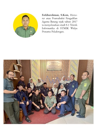 Fatkhurohman, S.Kom, Hono- rer atau Pramubakti Pengadilan Agama Batang sejak tahun 2017 ia menyelesaikan studi S-1 Teknik Informatika di STMIK Widya Pratama Pekalongan.
